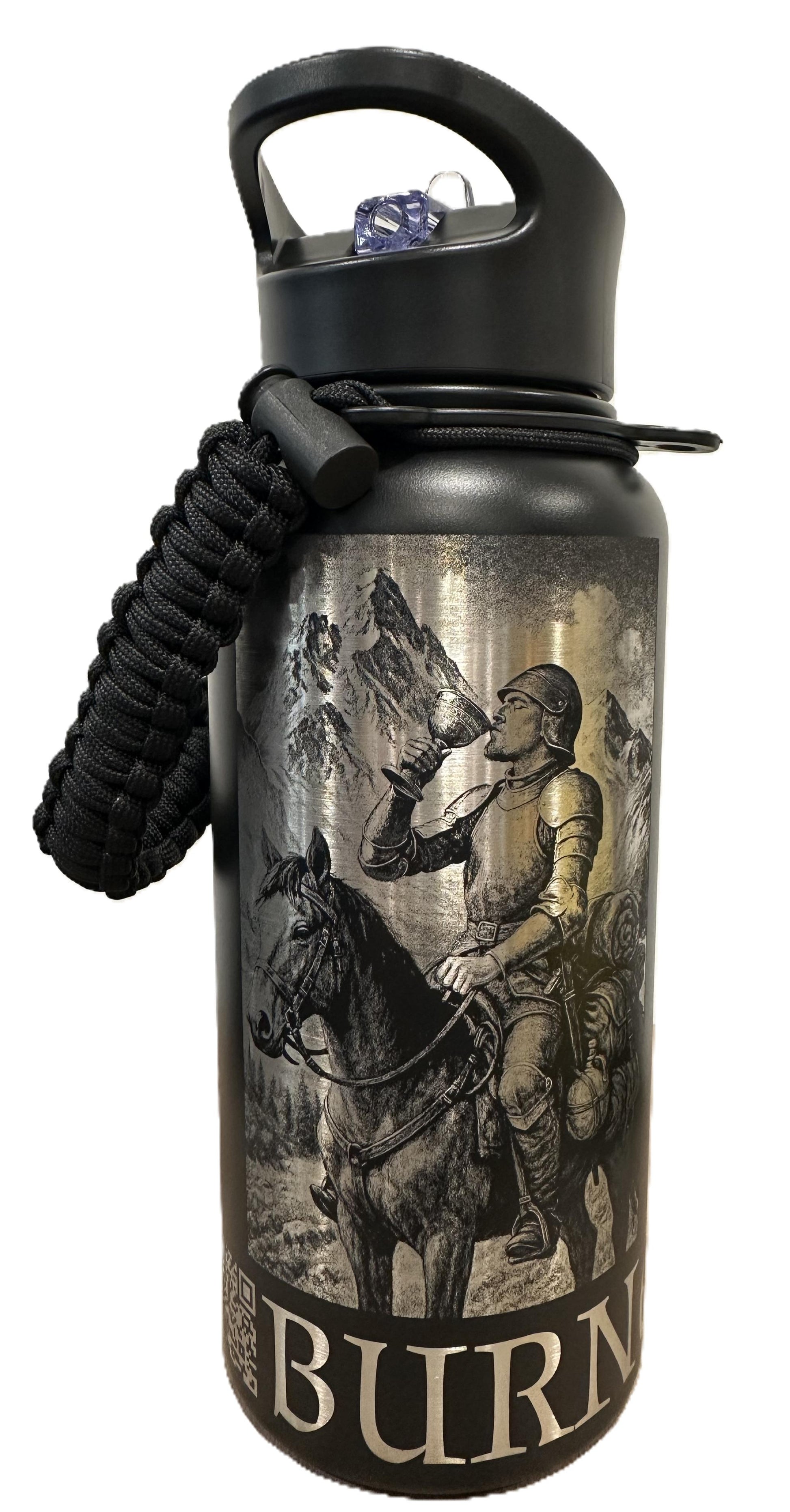 32-oz food-grade stainless steel bottle with a Standard Powder-Coated Finish. The coating is engineered for durability and consistent engraving results, producing crisp, high-contrast Burned Visions. This size comes standard with a straw lid, includes a Chug lid for fast, easy hydration and comes equipped with a paracord carrying handle.