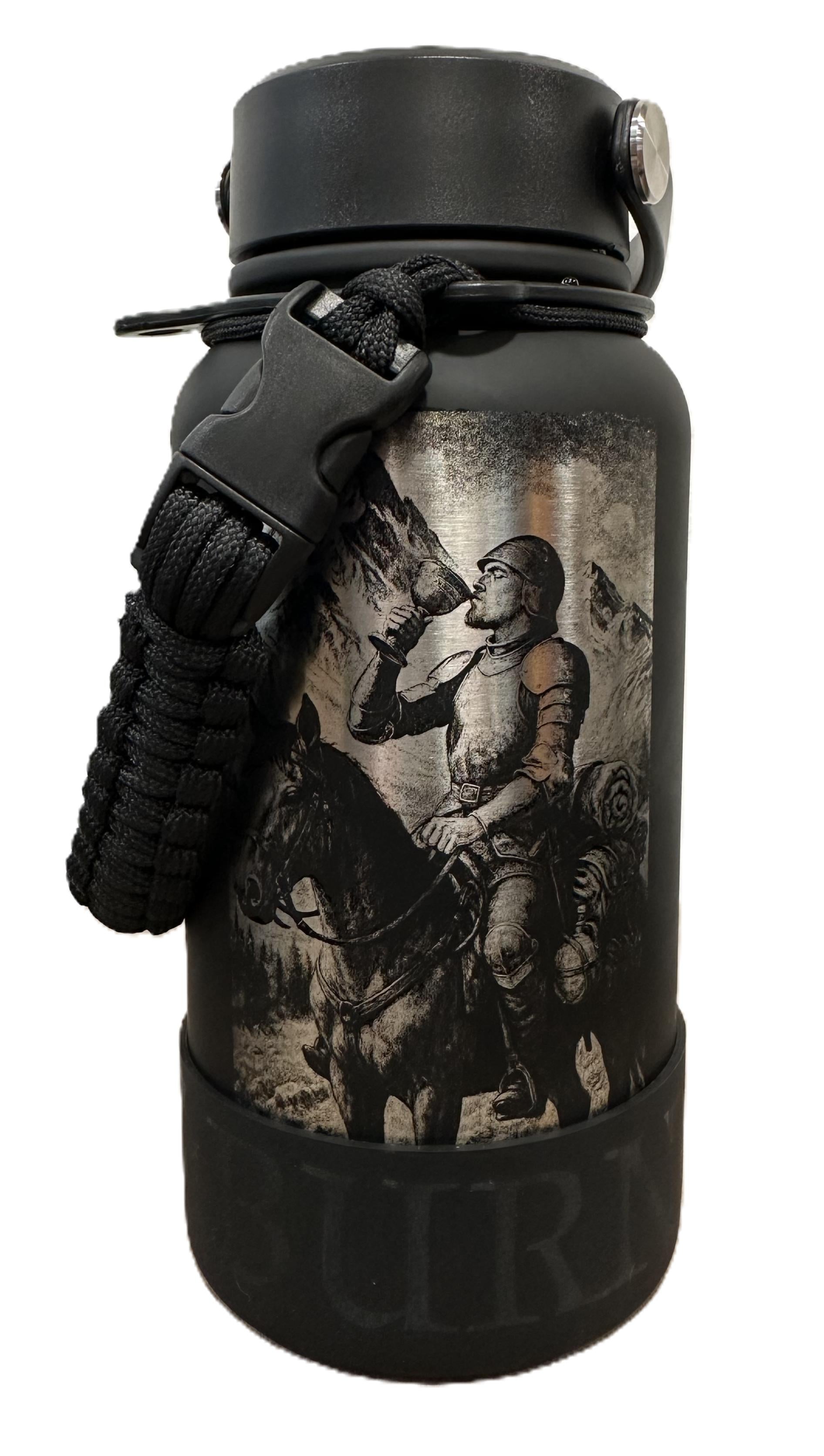 22-oz food-grade stainless steel bottle with a soft-touch powder-coated finish. The soft-touch coating provides a smooth, matte feel ,almost velvety while maintaining durability and excellent engraving contrast for detailed Burned Visions. This bottle includes a silicone protective boot to help prevent dents and reduce surface impact, and comes equipped with a paracord carrying handle.