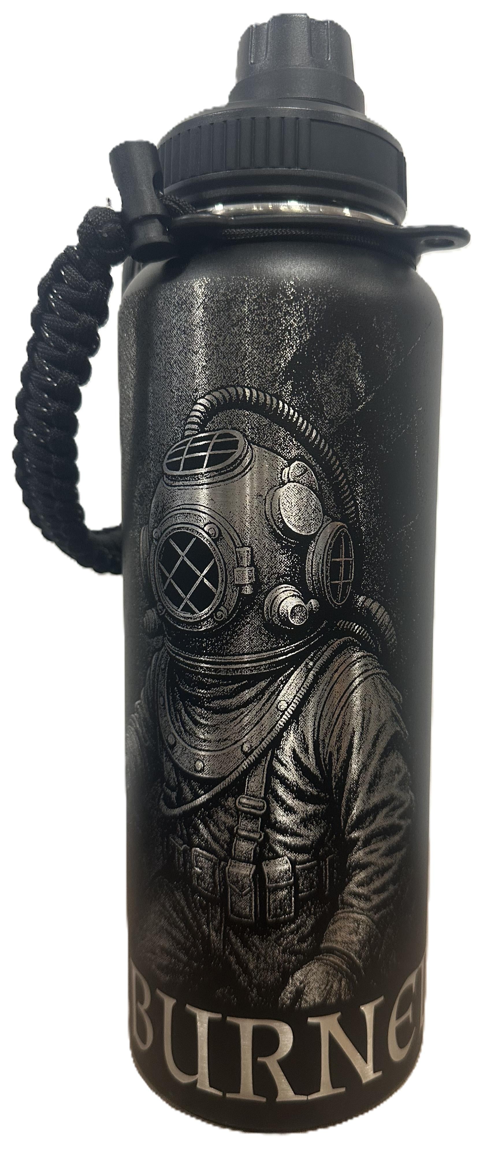 40-oz food-grade stainless steel bottle with a Standard Powder-Coated Finish. The coating is engineered for durability and consistent engraving results, producing crisp, high-contrast Burned Visions. Includes a paracord carrying handle.