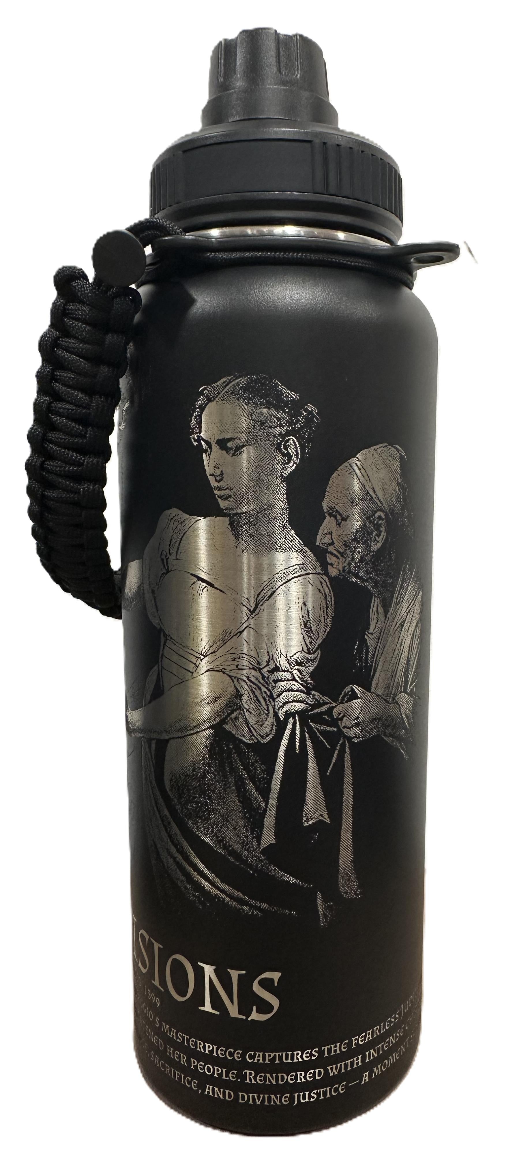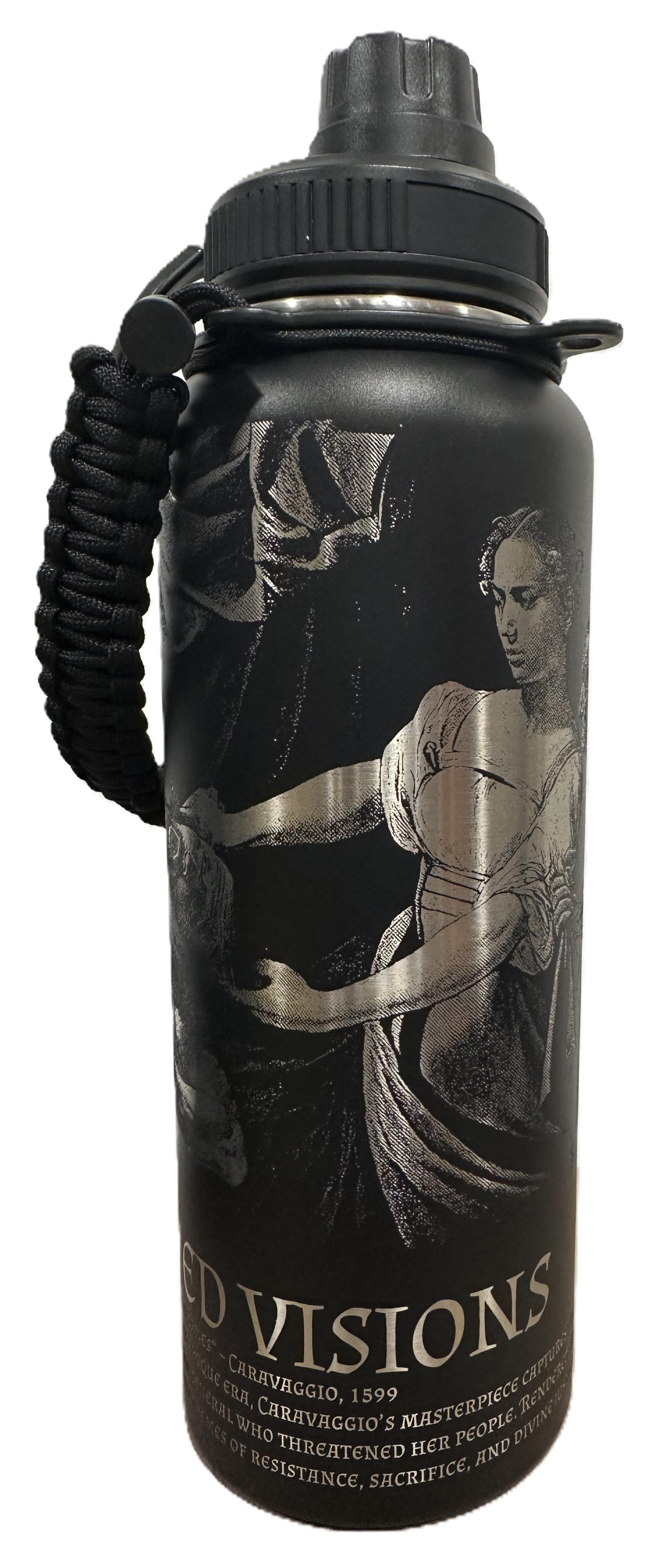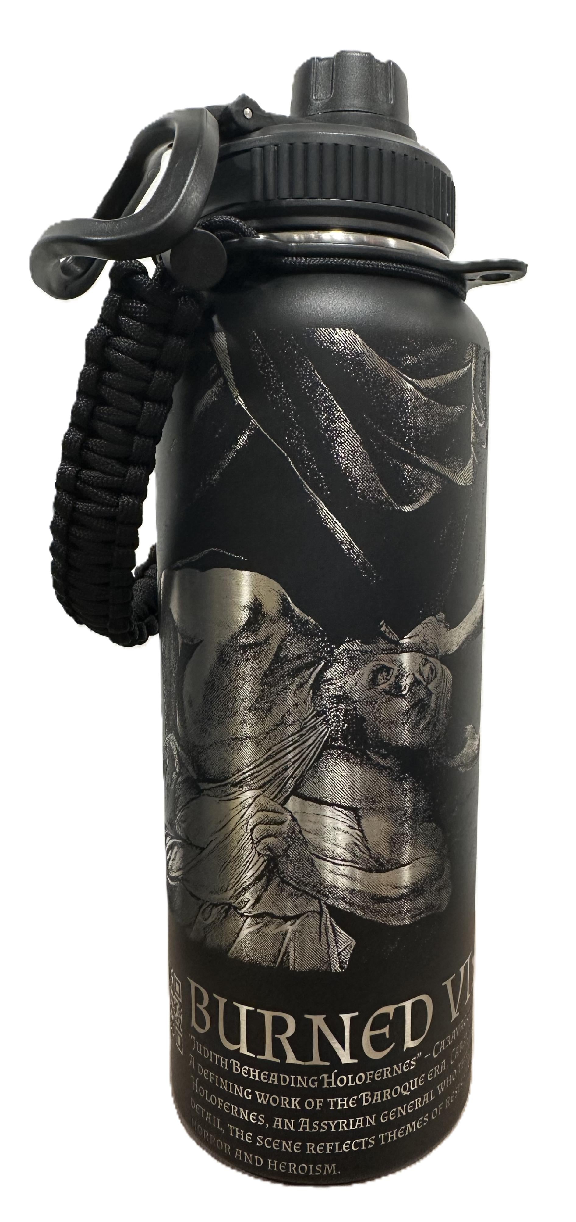 40-oz food-grade stainless steel bottle with a Standard Powder-Coated Finish. The coating is engineered for durability and consistent engraving results, producing crisp, high-contrast Burned Visions. Includes a paracord carrying handle.